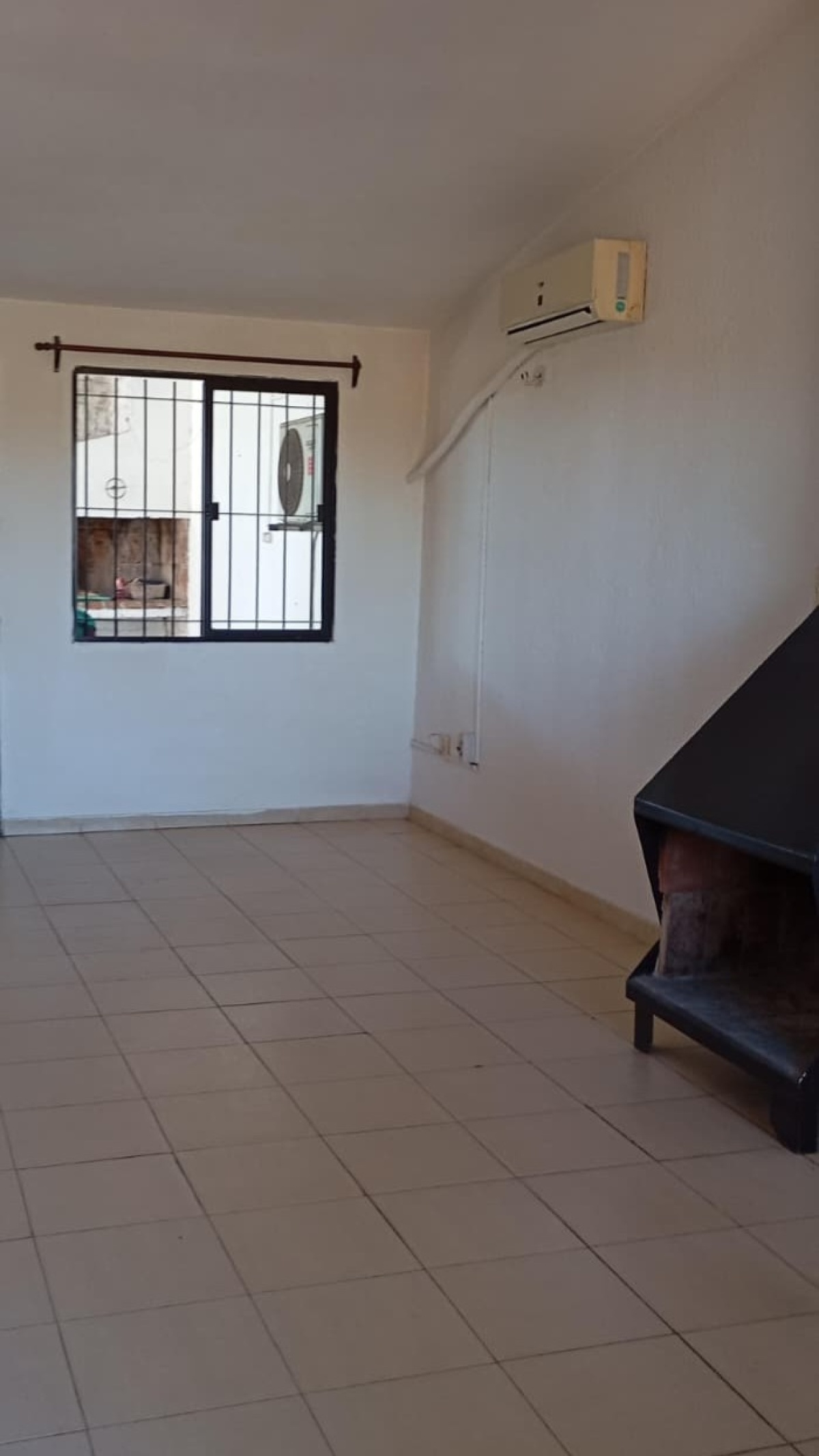 Living luminoso con estufa a leña, 2 dormitorios, baño, aire acondicionado, y cocina cómoda.